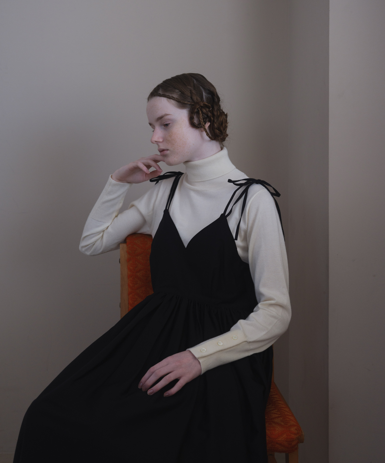肩紐と胸元のラインにキャミソールの軽やかさを残しながら、ギャザーを贅沢に入れ、スカート部分にしっかりとした分量感を持たせました。