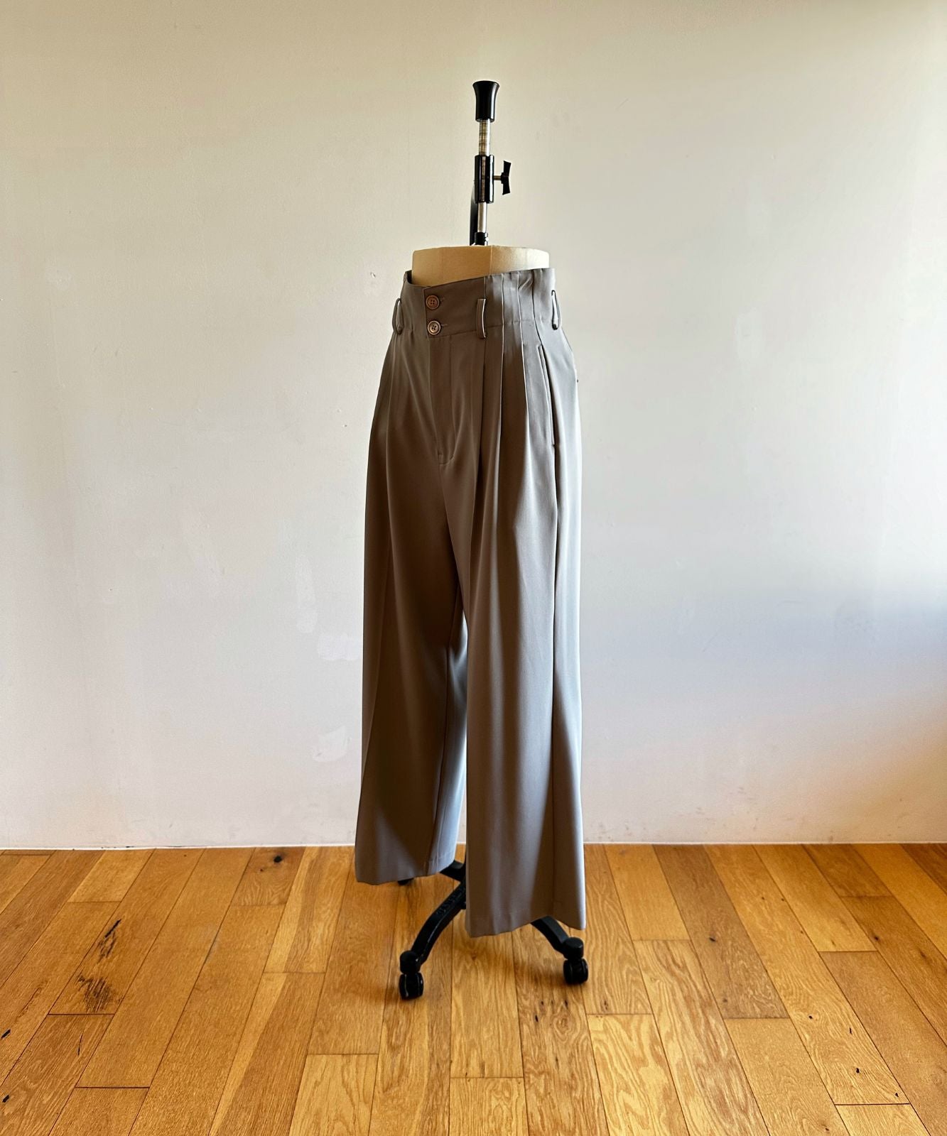 ワイドサイズのガボットしたシルエットですが、3本のアウトタックが入ることでだらしない印象にはなりません。