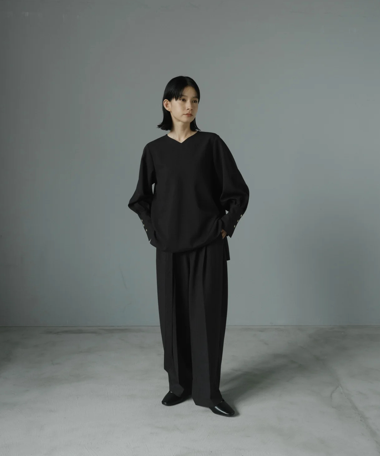 ① 揺れるシルエットで楽しむ、レディライクなオールブラック