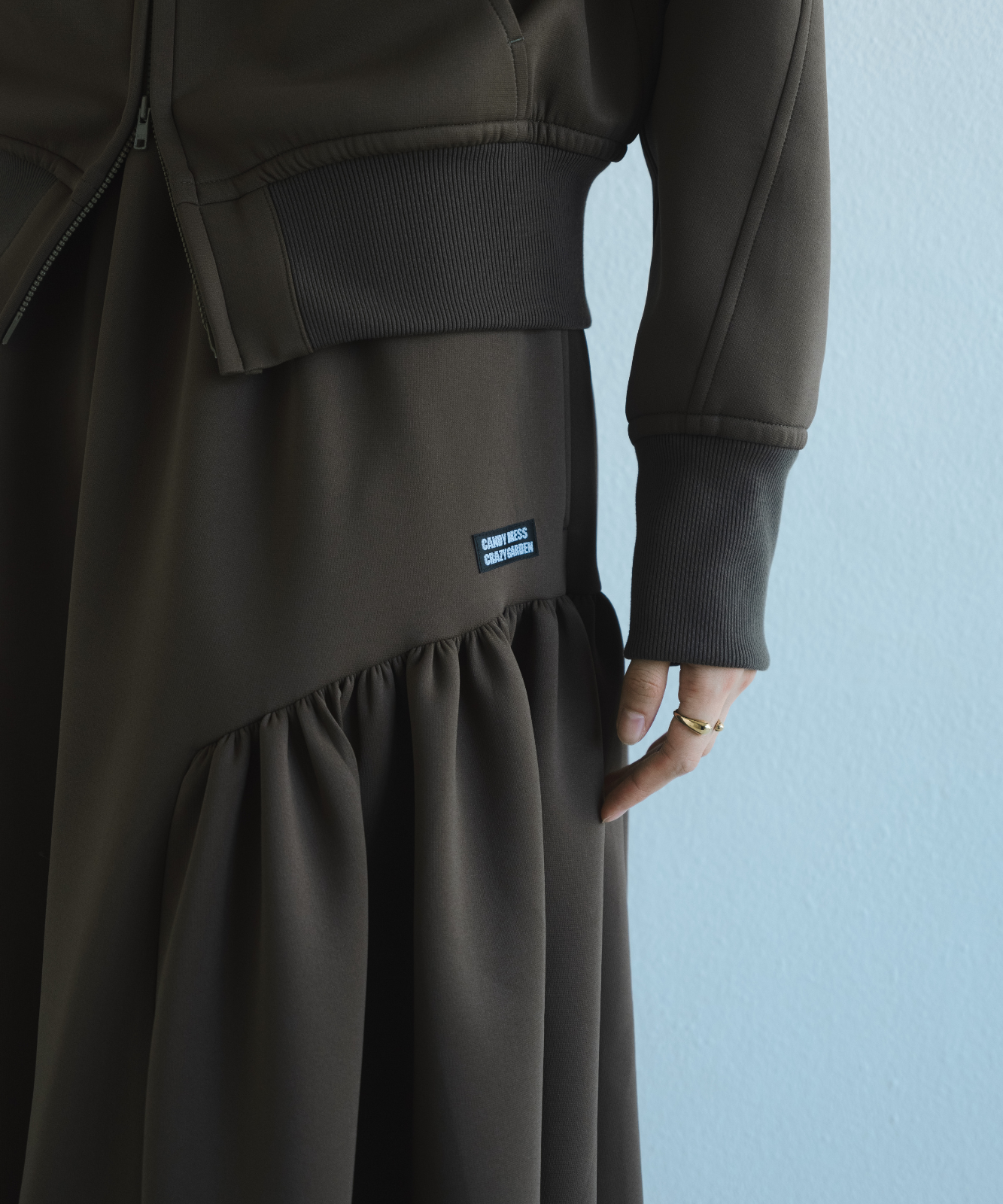 大胆な切り替えとギャザーがジャージらしからぬ可愛さ。