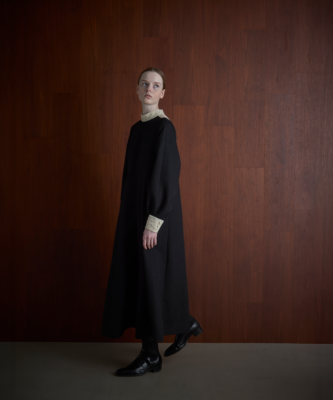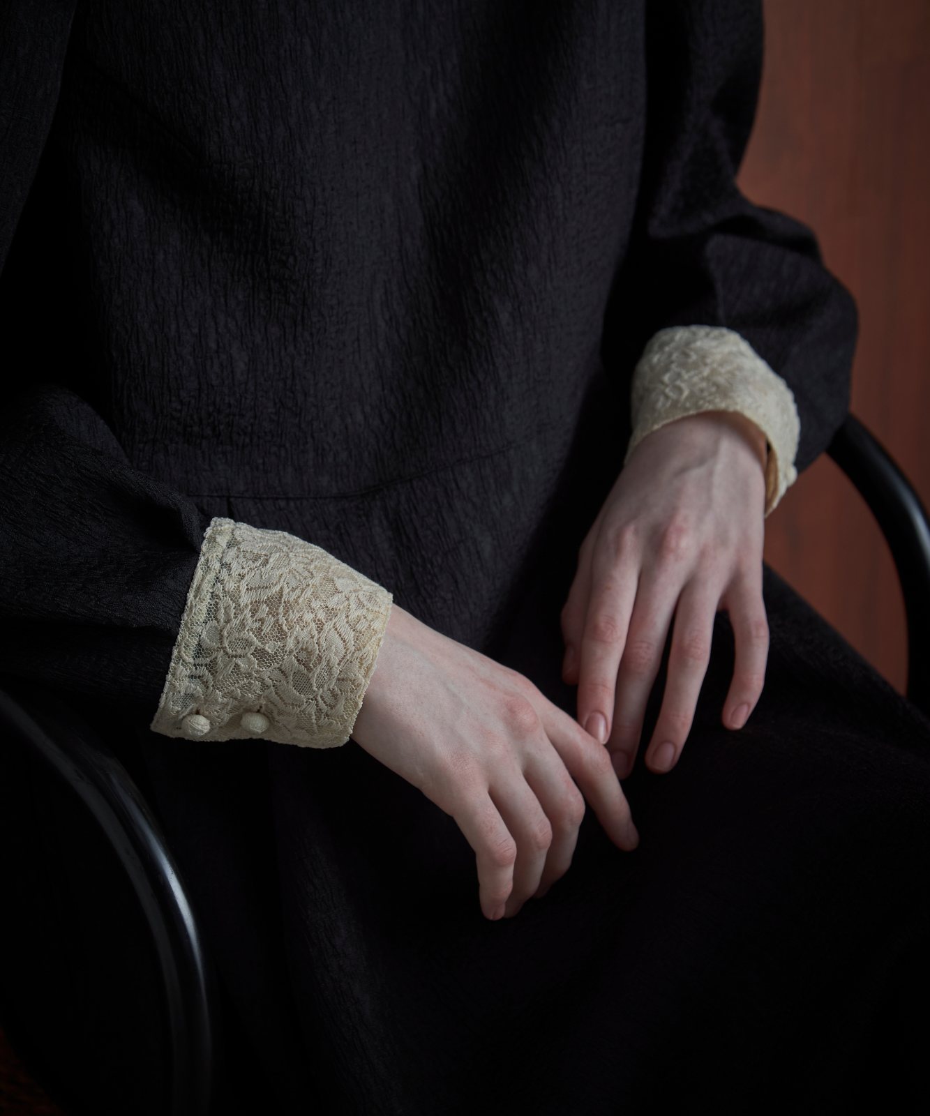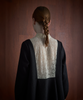 襟とカフスにも同じレースをあしらい、黒と生成りのバイカラーが、モードな緊張感を与えてくれます。