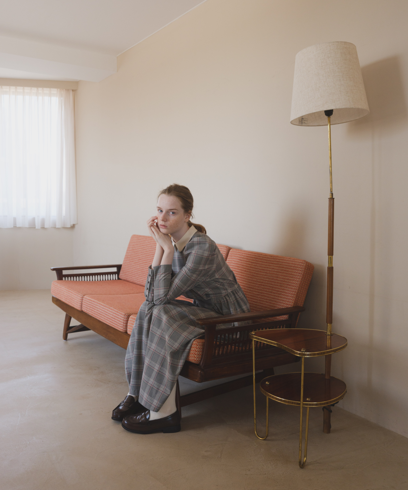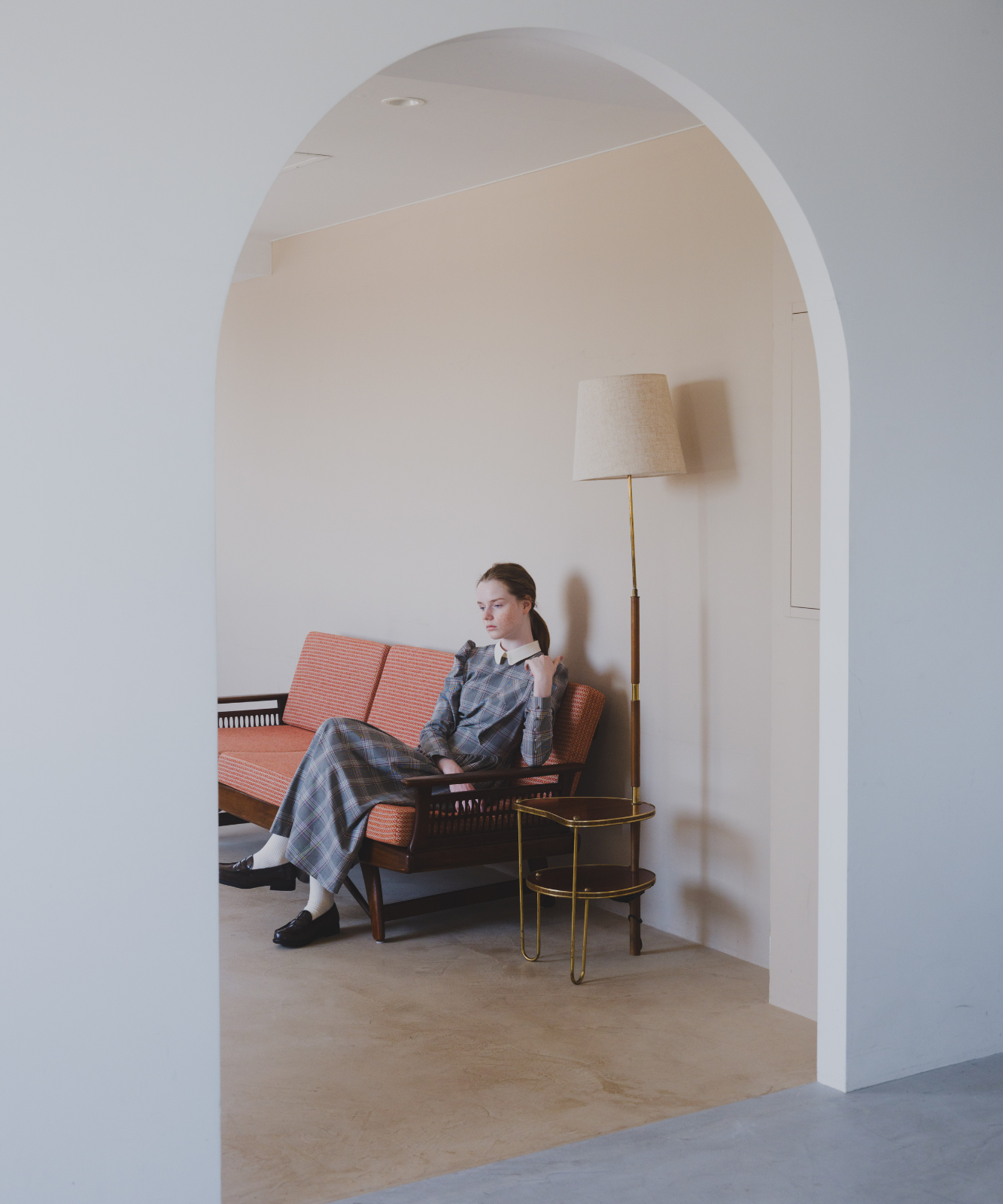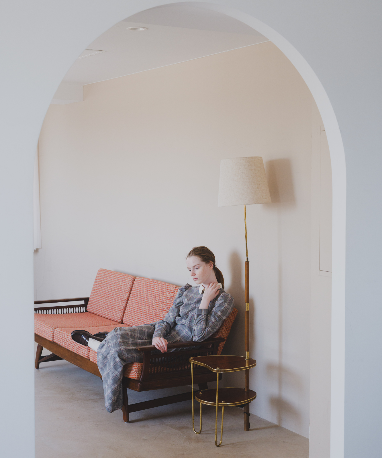 胸元にはひとつ、ちいさなポケット。チェック柄の中に自然に溶け込みながら、ほんの少しだけリズムを与えるチャーミングなディテールです。