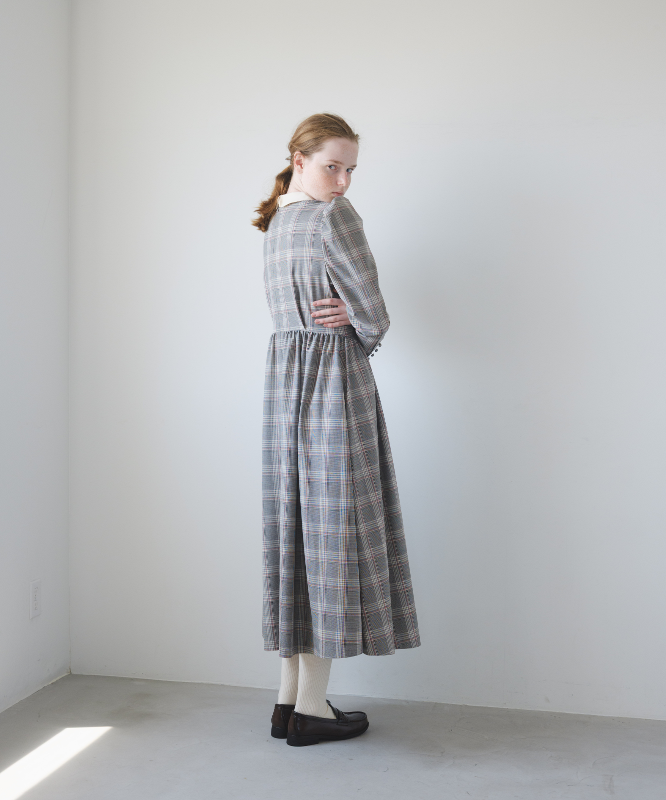 アイボリーの丸襟が、ドレス全体にほどよい抜け感を与えています。甘すぎず、堅すぎず。ギャザーとの相性もよく、レトロな空気を品よくまとめるアクセントに。