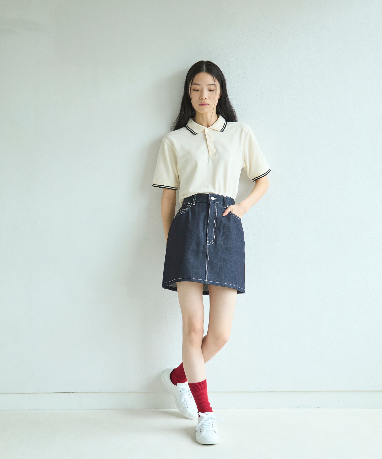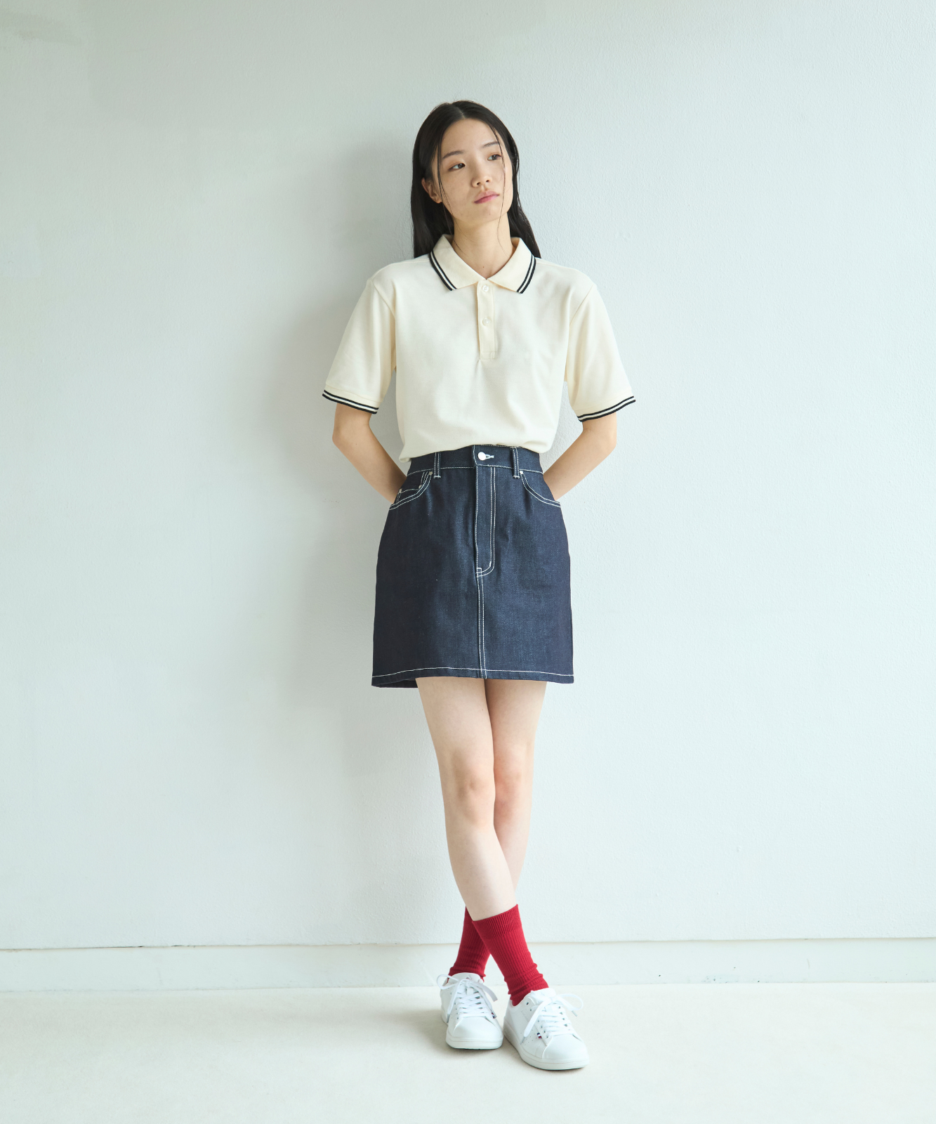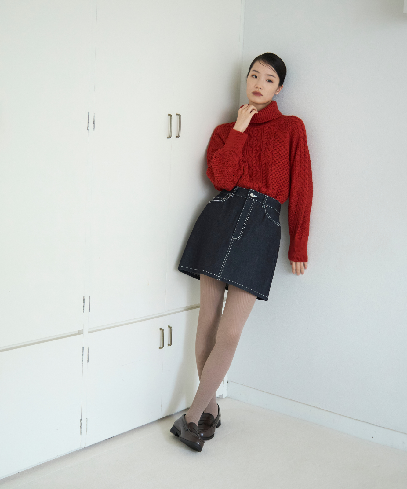 コンパクトなデニムスカートの対比が魅力のスタイリング。