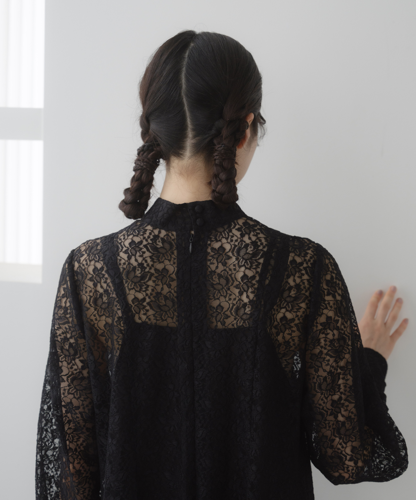 袖とヨーク部分は裏地を省き、レースの透け感をそのまま楽しめる仕様に。