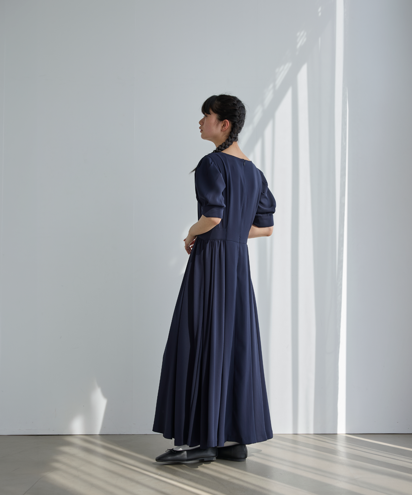歩くたびに生まれるドレープは、ただ重力に負けて垂れ下がるのではなく、空気を含んでしなやかに跳ねる。