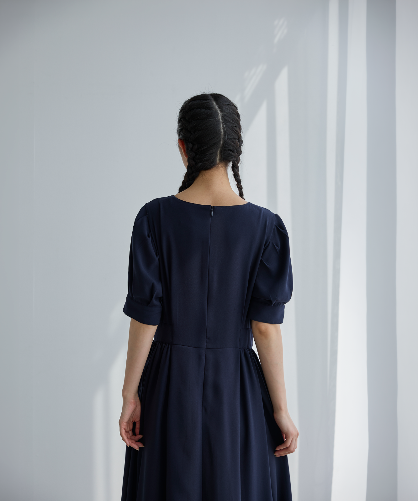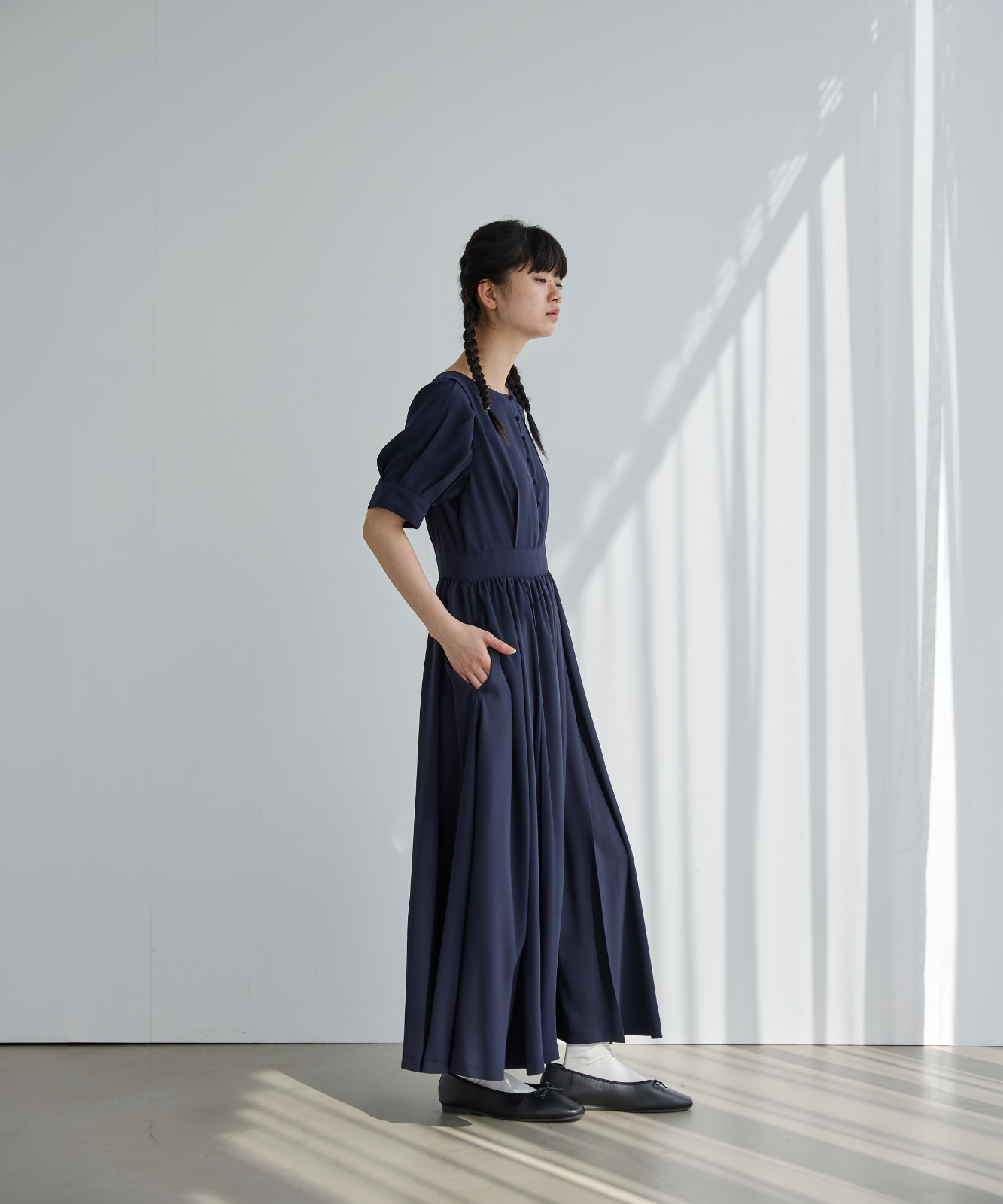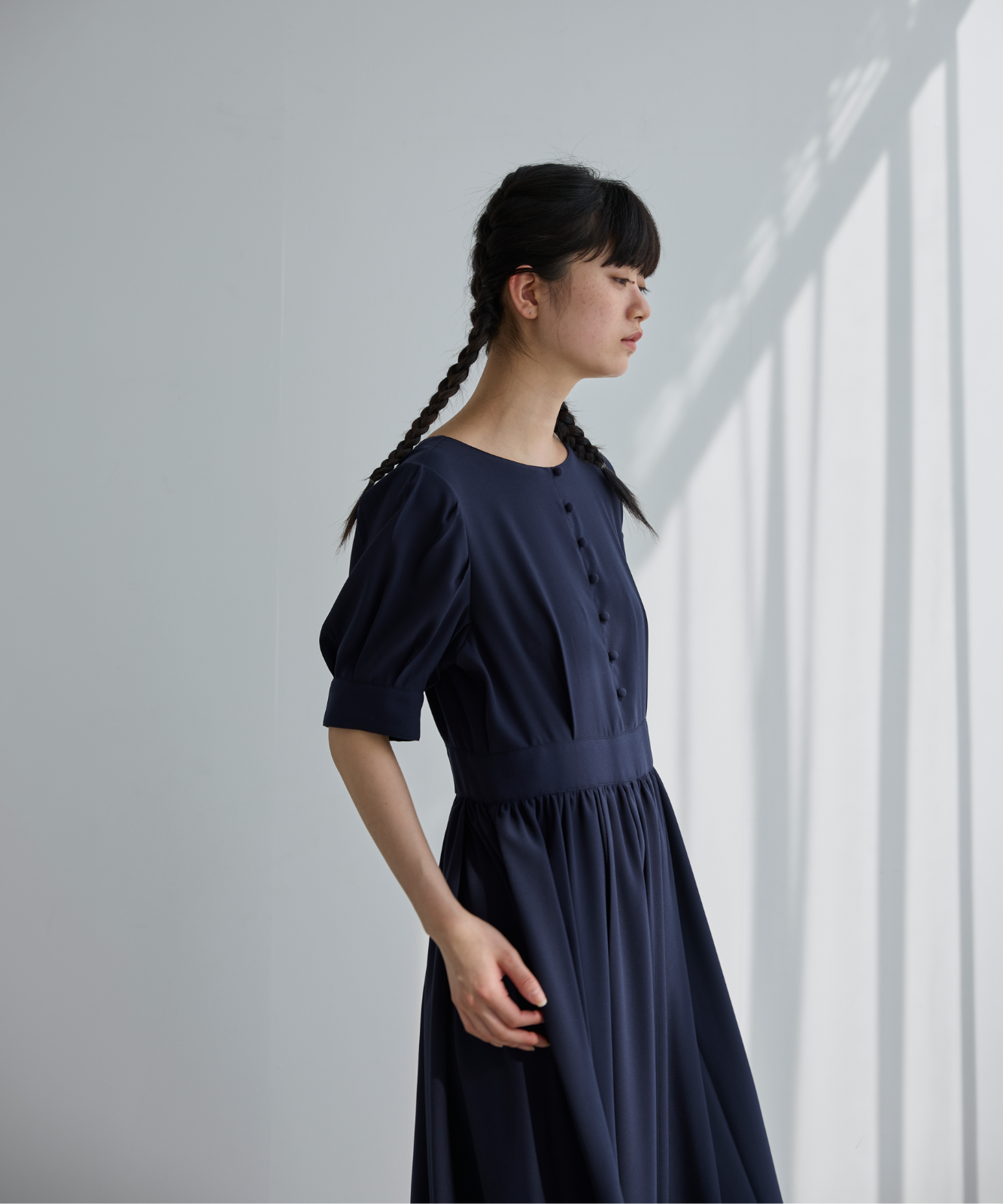 この小さなボタンたちが、ゆったりとしたシルエットに一本の筋を通し、 「イージー」な着心地を、「エレガント」へと昇華させています。