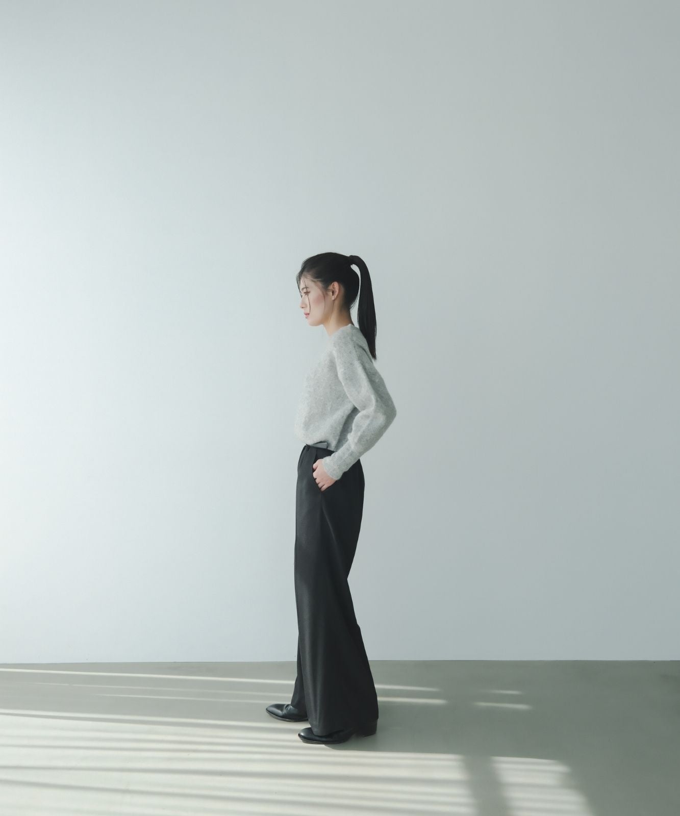 裾、地面ぎりぎりでスニーカーや革靴の先がちらっと見えるのが良いですね。